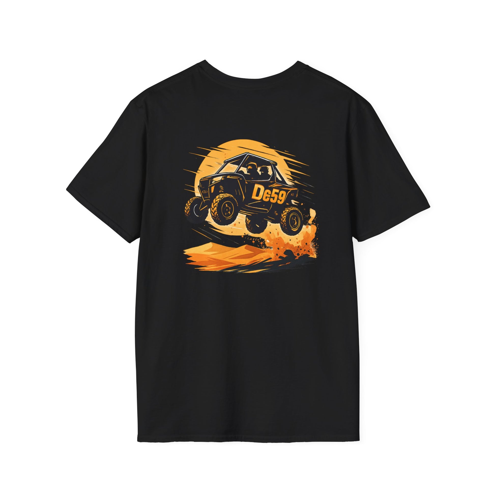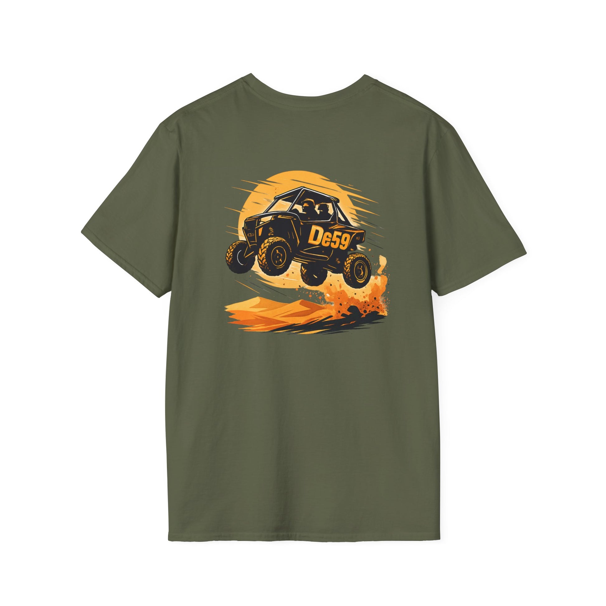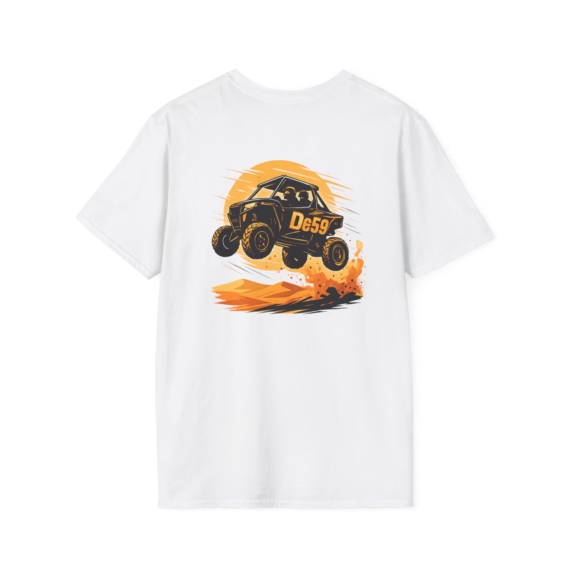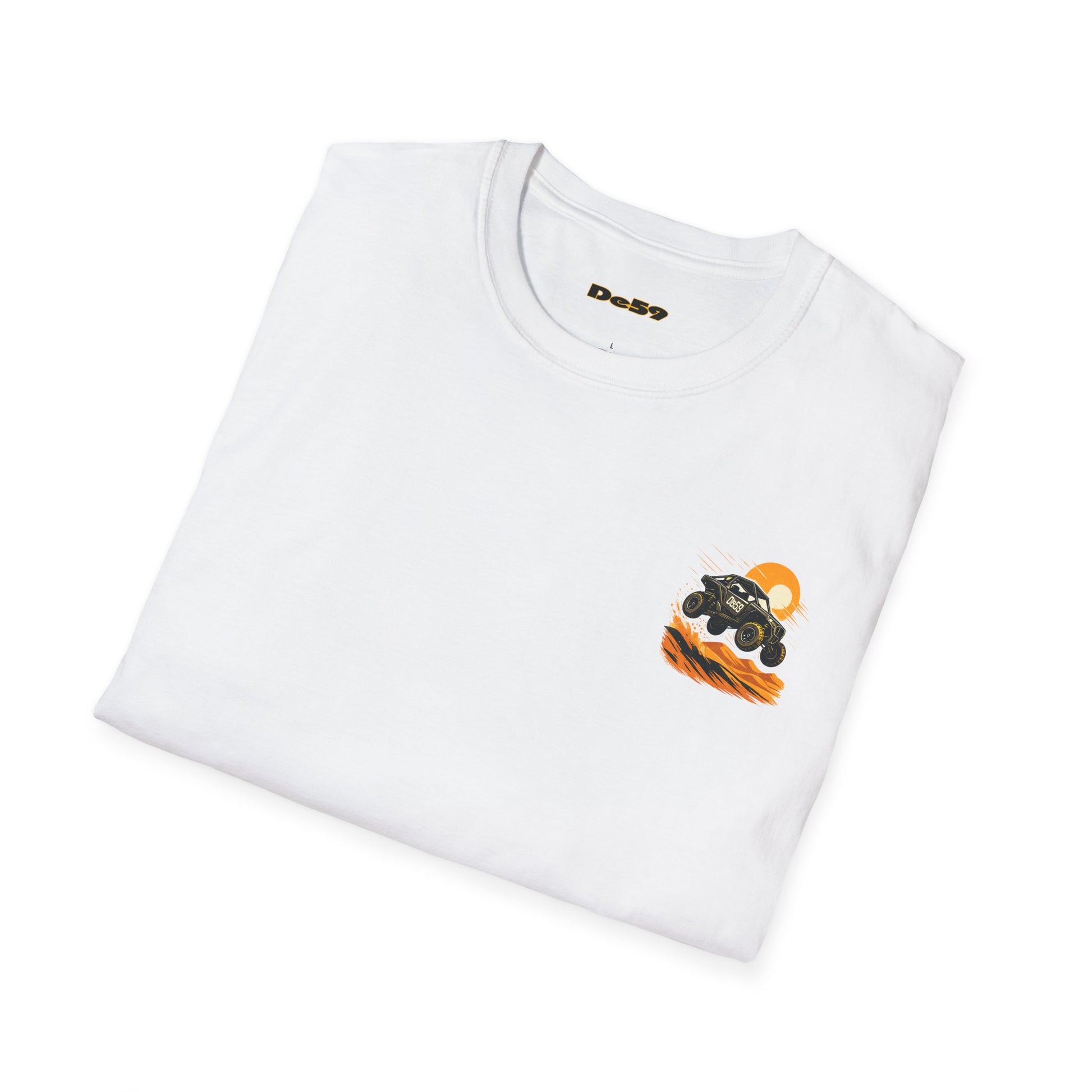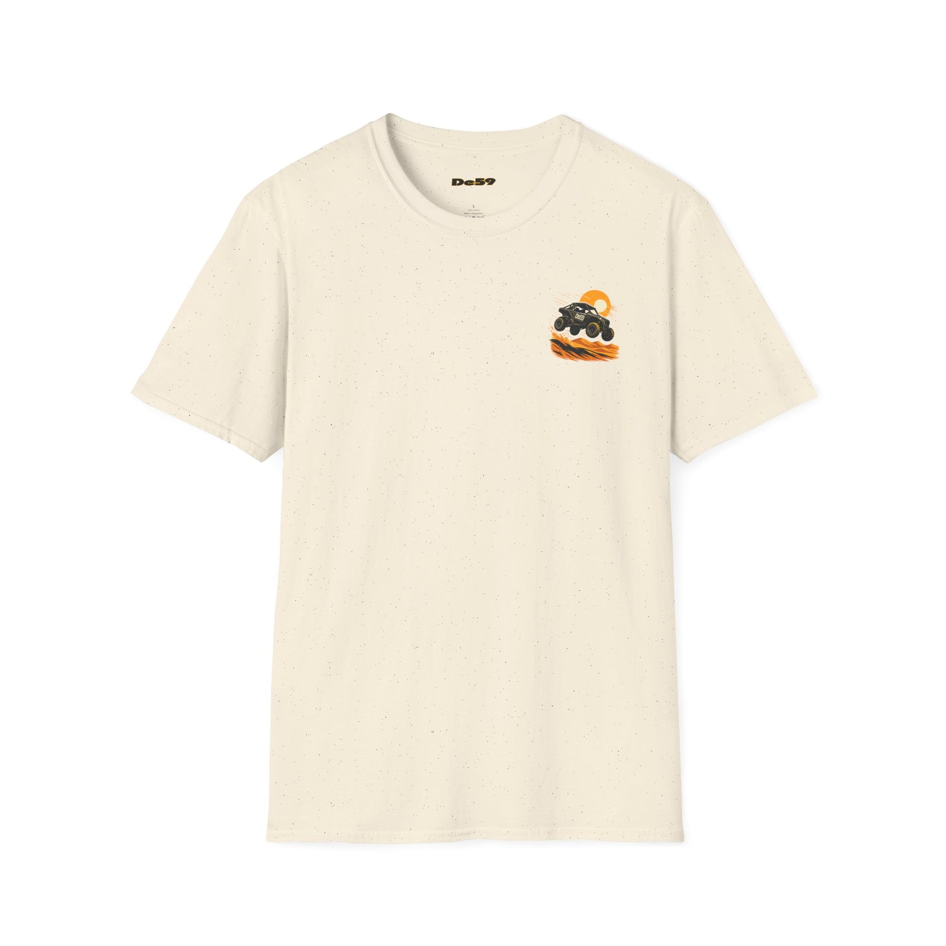Lightweight, breathable, and built for movement—this crewneck tee carries the rush of off-road racing in a soft, everyday silhouette. The front features a small, playful buggy emblem over the heart, while the back erupts with a dynamic dune-jump illustration in warm sunset tones. Wear it when you want the feel of grit and sun on your skin: on weekend drives, at track days, or while swapping stories around a campfire after a long trail. The fabric is smooth and durable, with a ribbed collar that holds its shape and shoulder tape for long-lasting structure. Subtle flecks in the natural color give a lived-in character, and the tear-away label keeps comfort front and center.