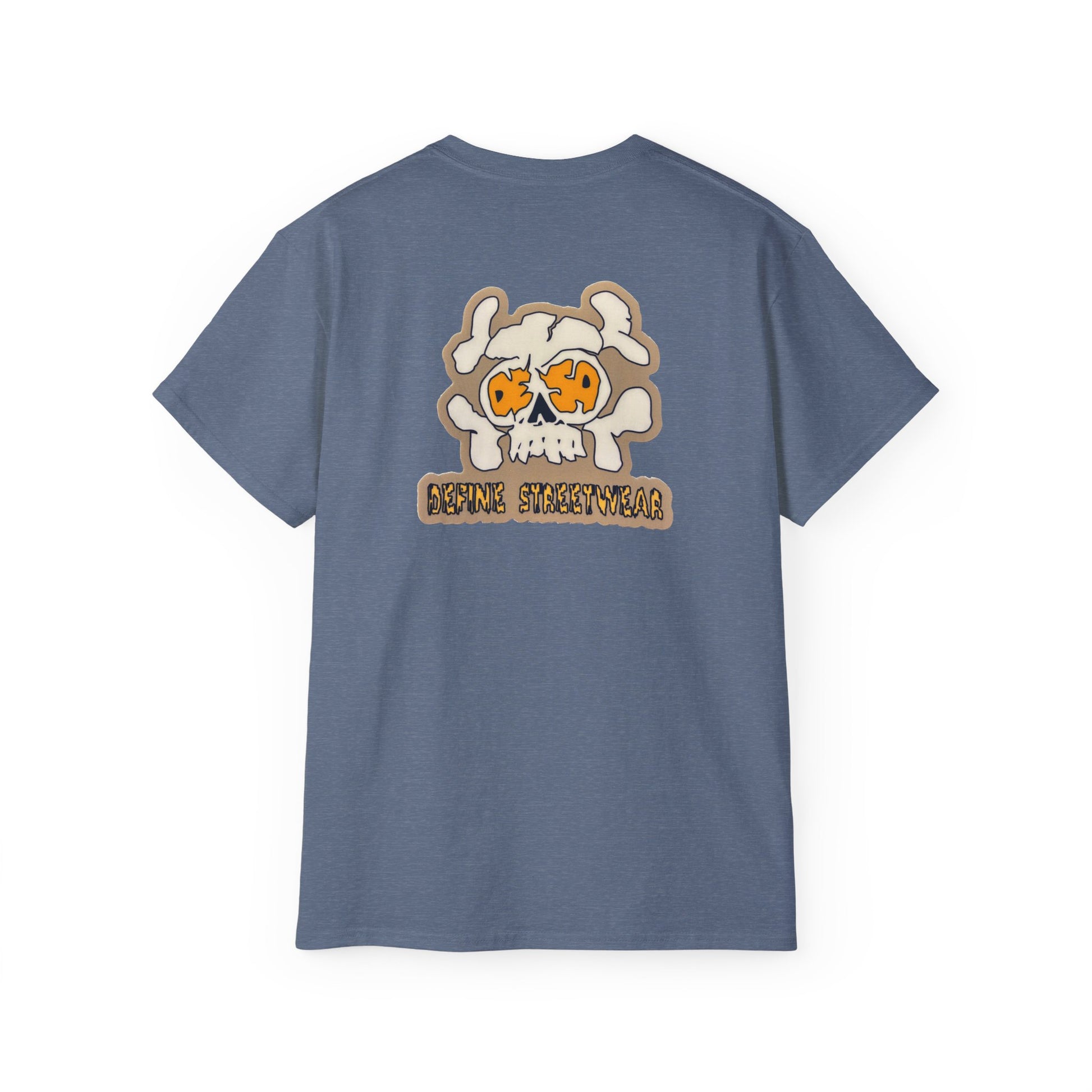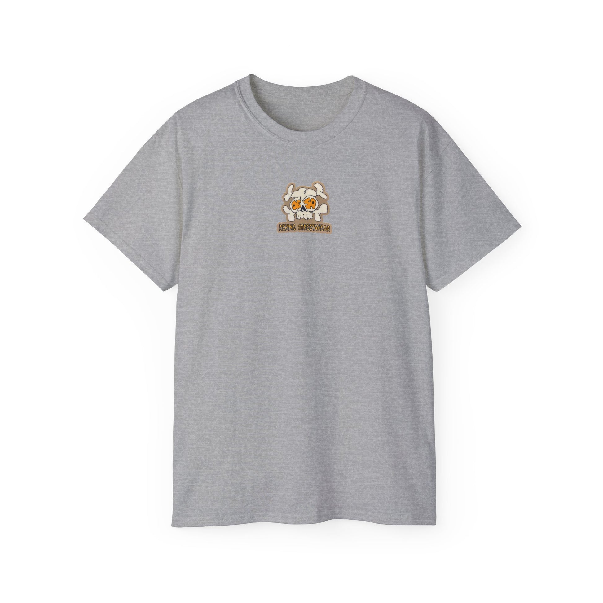 This soft, slightly vintage-feel tee carries a playful skull-and-sun motif that reads like a laid-back surf-and-street badge. The front shows a small, hand-drawn skull with orange sunburst eyes; the back repeats the design larger with a distressed-type logotype beneath it. It feels lived-in from the first wear — substantial cotton, breathable midweight fabric, and a roomy cut that hangs casually over jeans, boardshorts, or layered under a flannel. Wear it to skate sessions, beach bonfires, or weekend coffee runs when you want a bit of edge without shouting. The muted heather texture and natural flecking give the graphic an artful, worn-in look that ages well and invites companion pieces in your wardrobe.